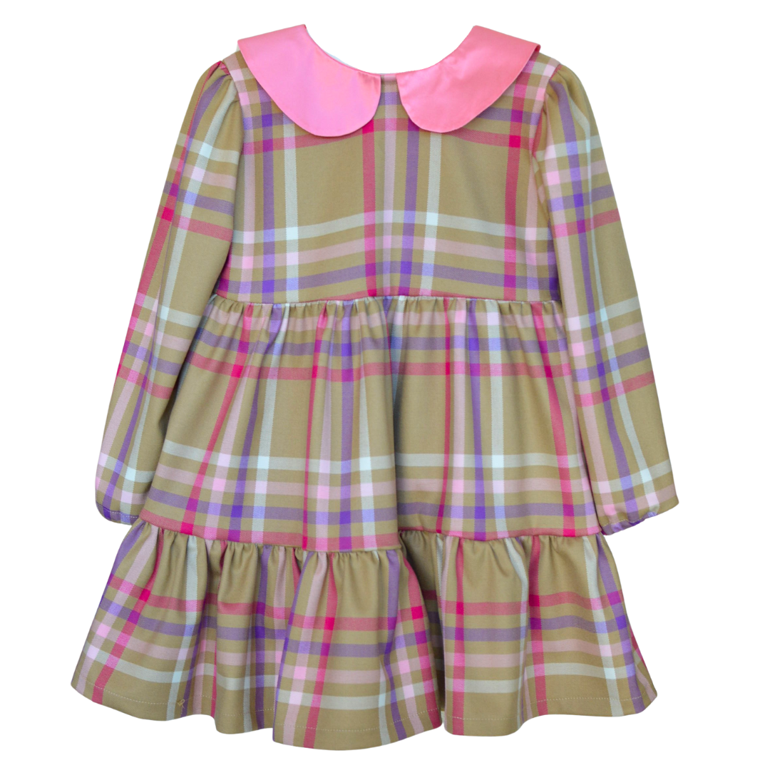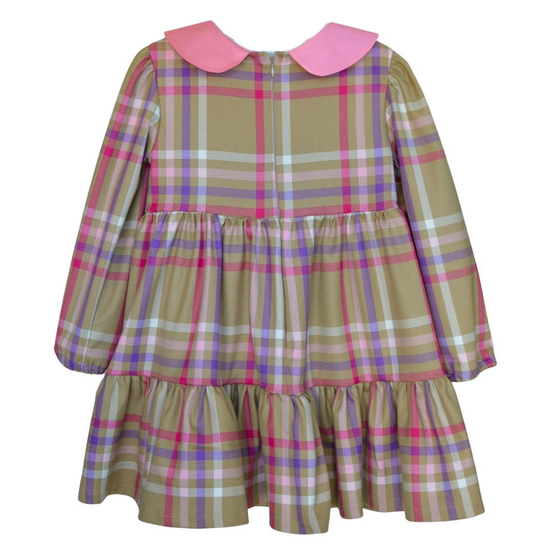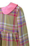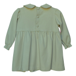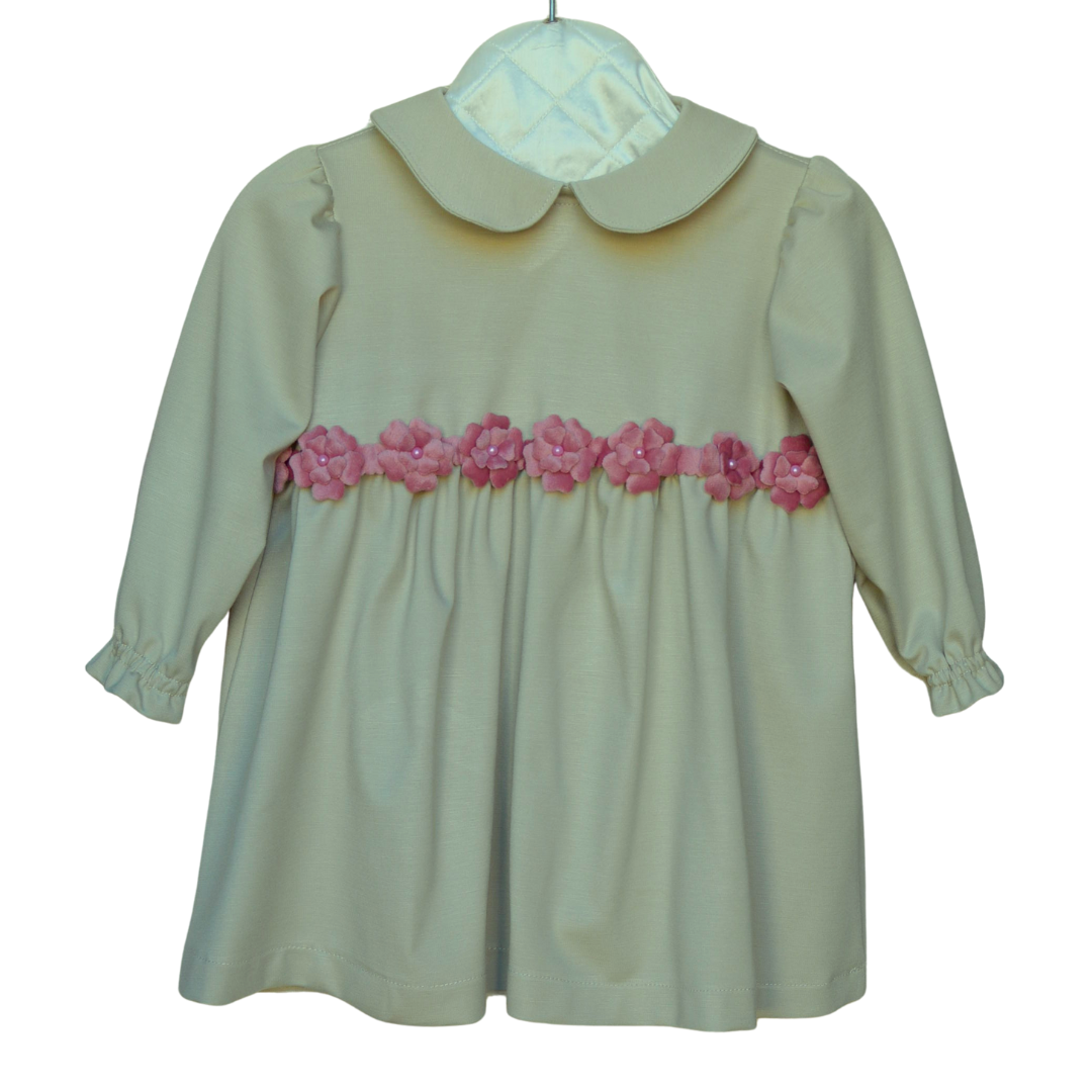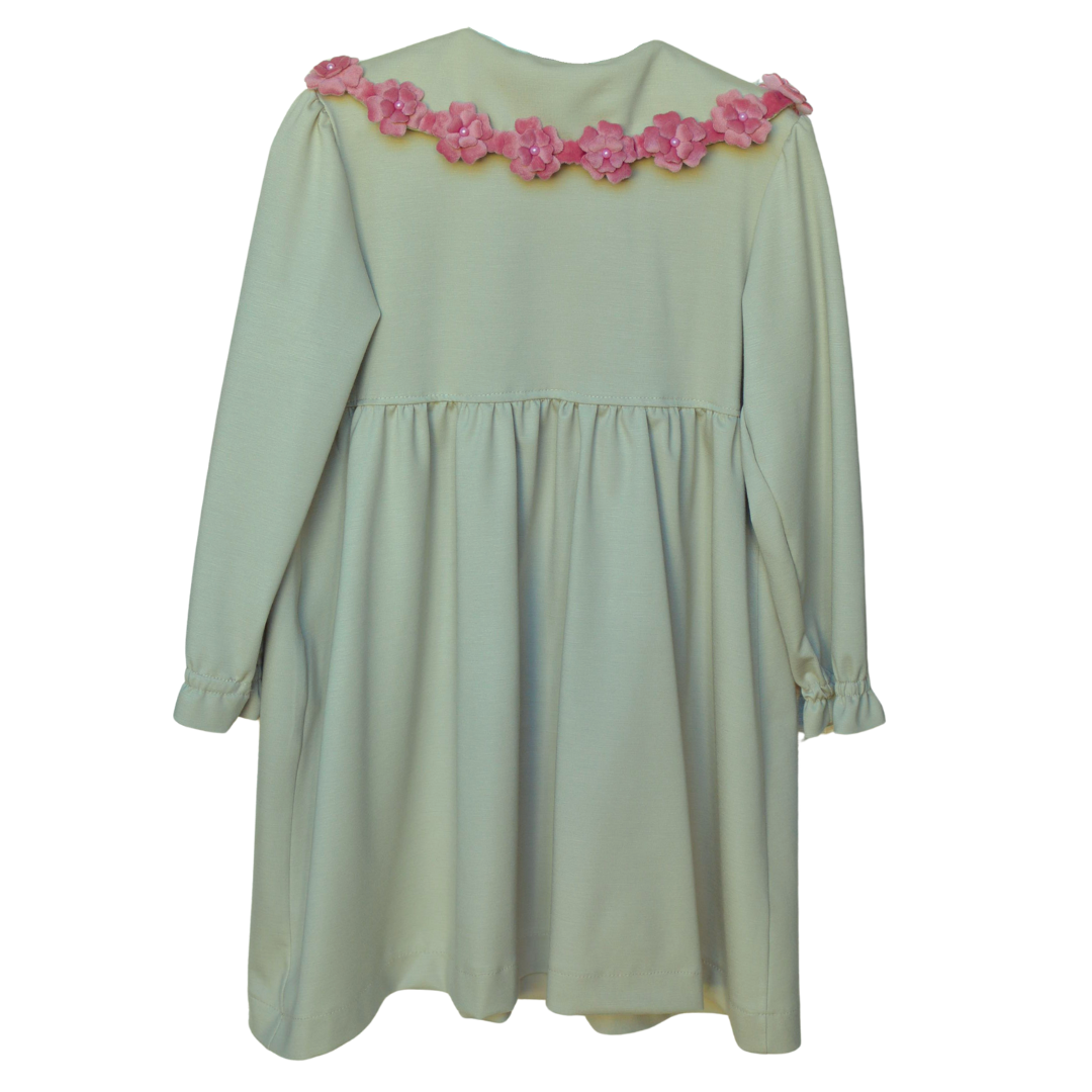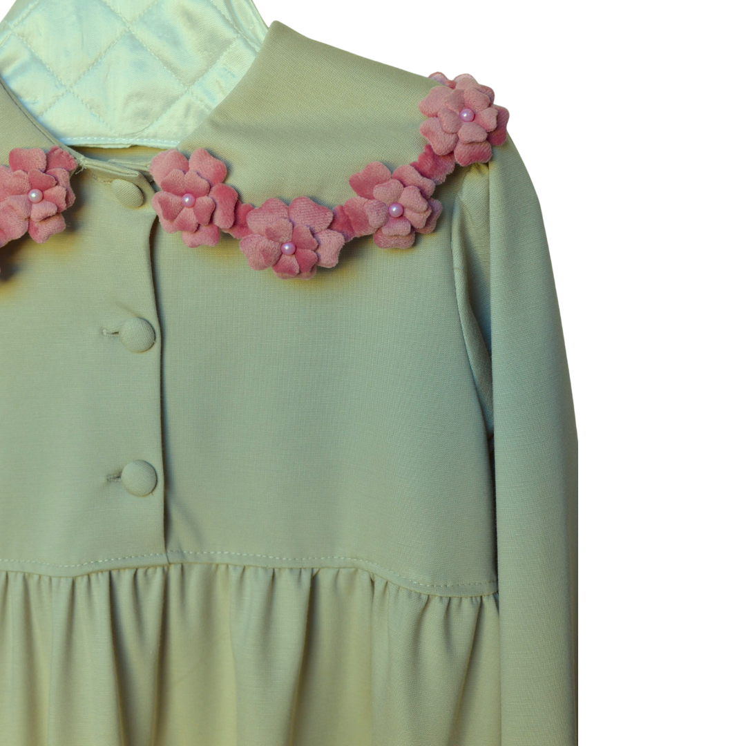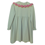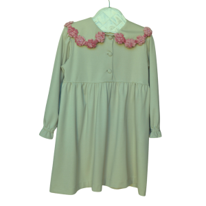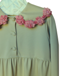 Modello aperto davanti con bottoni rivestiti, collo con applicazioni fiori in velluto e centrale con perla, gonna arricciata e manica con elastico sul polso. Tessuto in viscosa elasticizzato. Cerchietto abbinato. Disponibilità immediata